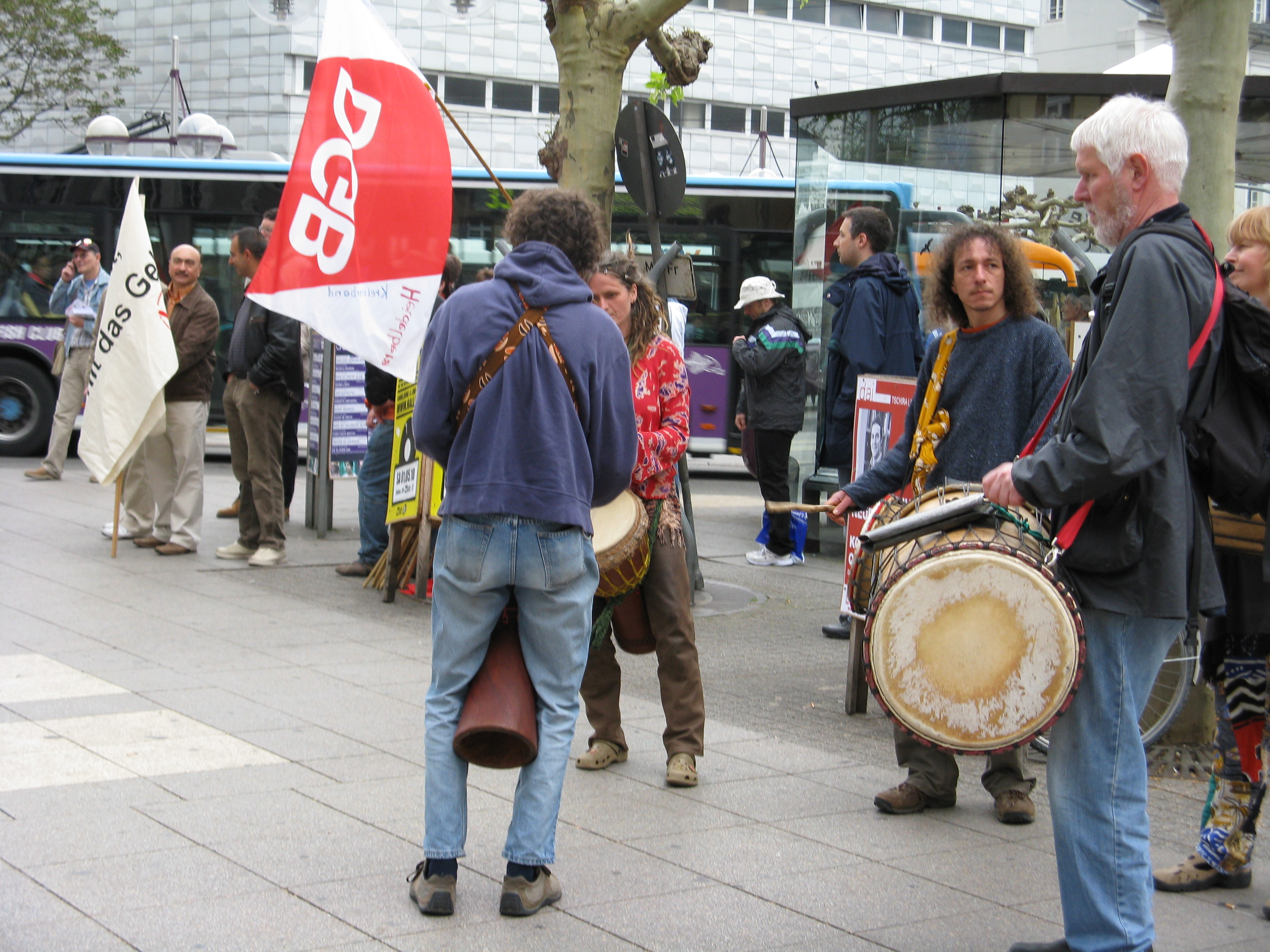 Bismarckplatz 10.30 Uhr, die Trommelgruppe LOLOKAN legte los, der Platz füllte sich langsam, aber stetig. Erstaunlich viele Familien mit Kindern, auch noch ganz Kleinen. Von Vertrauensleuten und Betriebsräten gemalte Transparente und ganz viele Fahnen der DGB Gewerkschaften waren zu sehen.