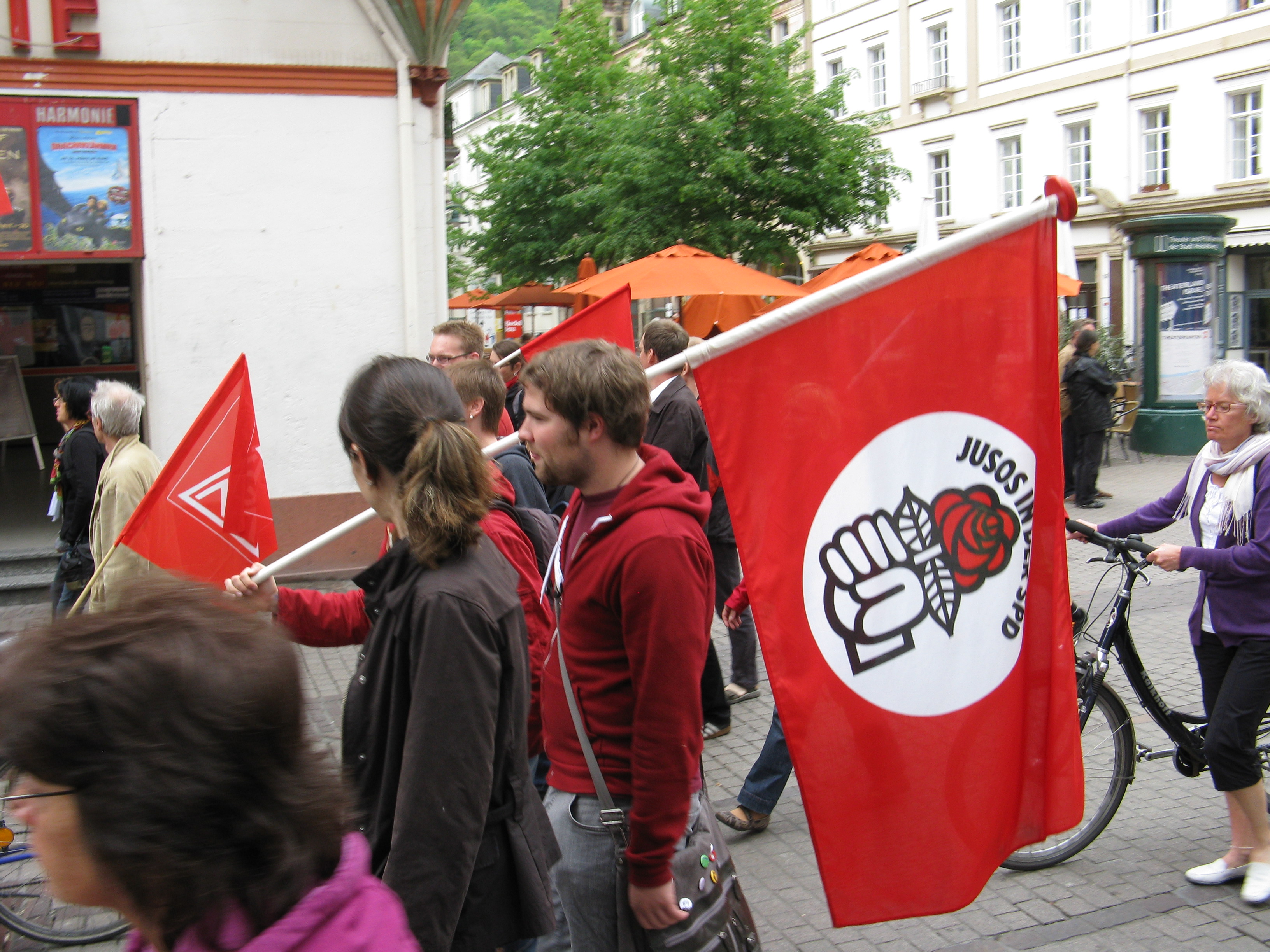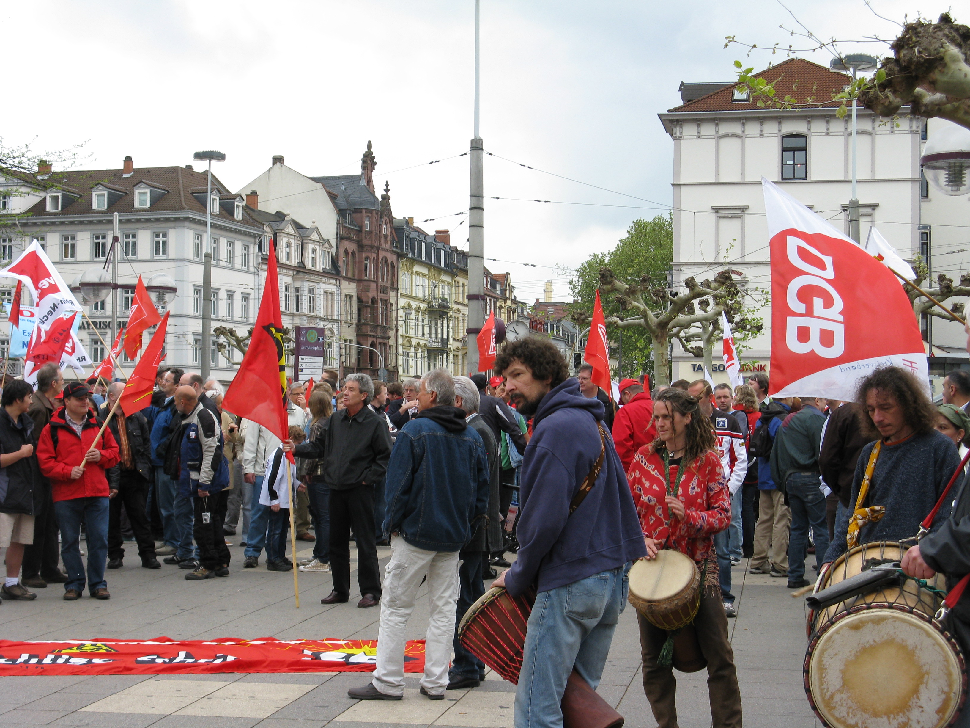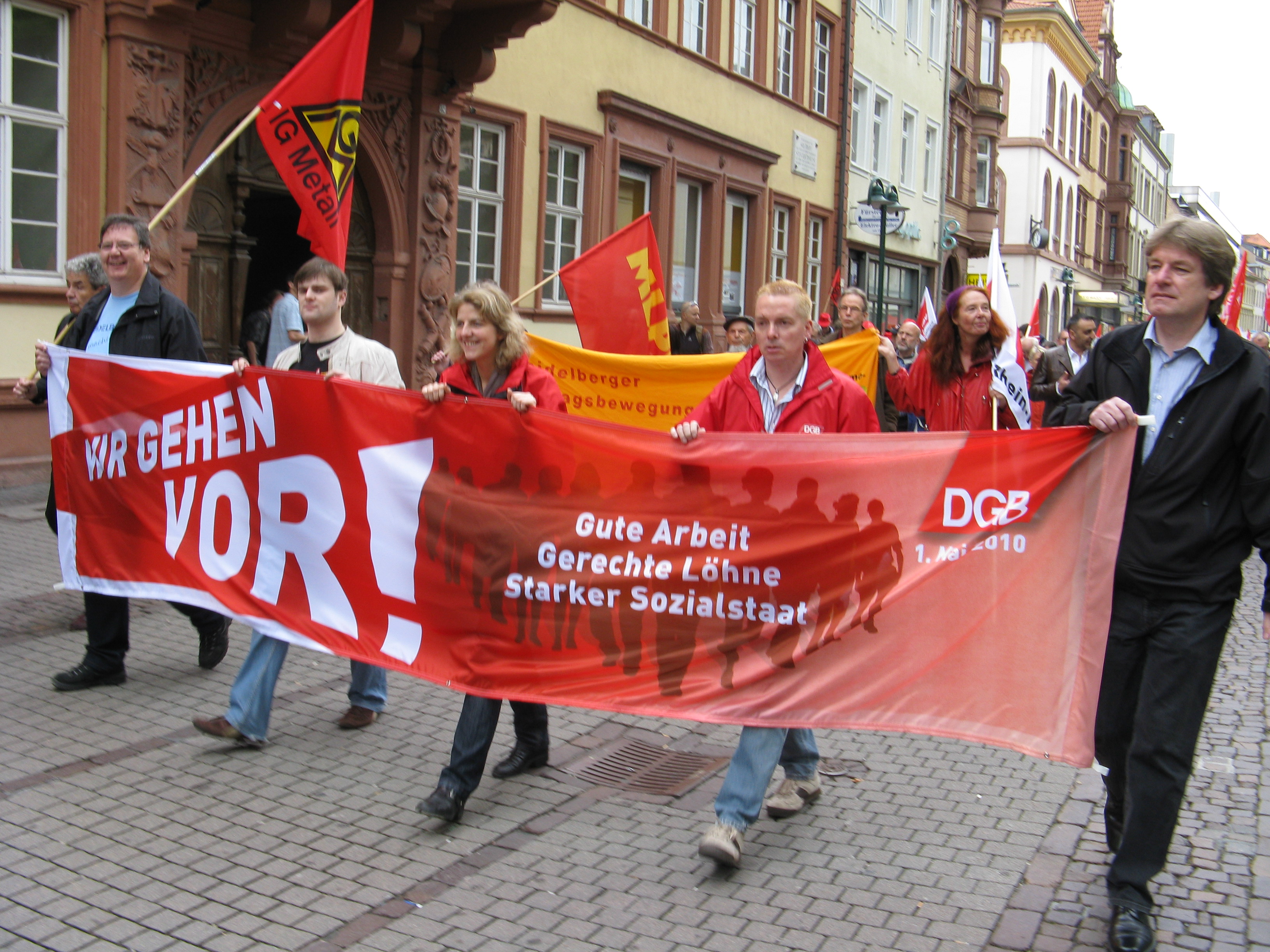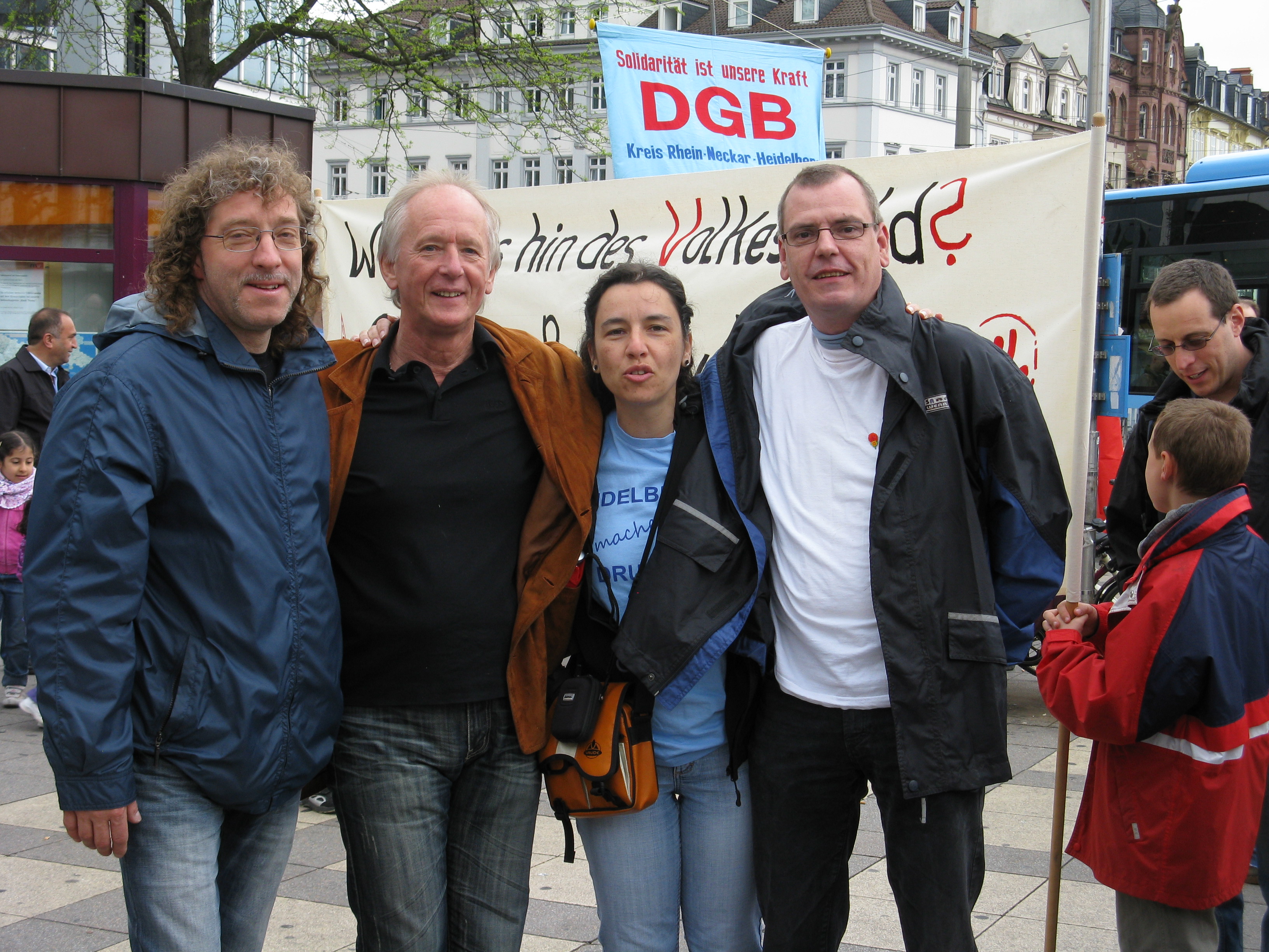Beim Abmarsch zum Rathaus um 11.00 Uhr waren wir nach Polizeiangaben 350 Menschen, bei der Ankunft auf dem Marktplatz waren es schon über 450 Beteiligte beim Demonstationszug. Die größere Beteiligung lag sicher daran, dass Kollege Rainer Wagner, GBR Vorsitzender der Heidelberger Druckmaschinen einen aktuellen Situationsbericht bei HDM gab. Aber sicher auch daran, dass dieses Mal Kollege Peter Erni, der Vorsitzende von ver.di Rhein-Neckar die Maiansprache hielt. Ein weiterer Grund sicher die allgemeine Verunsicherung in vielen Betrieben und die wieder aufflammende Aktionstätigkeit der Studierenden für bessere Bildung danach halbwegs sichere Arbeitsplätze.