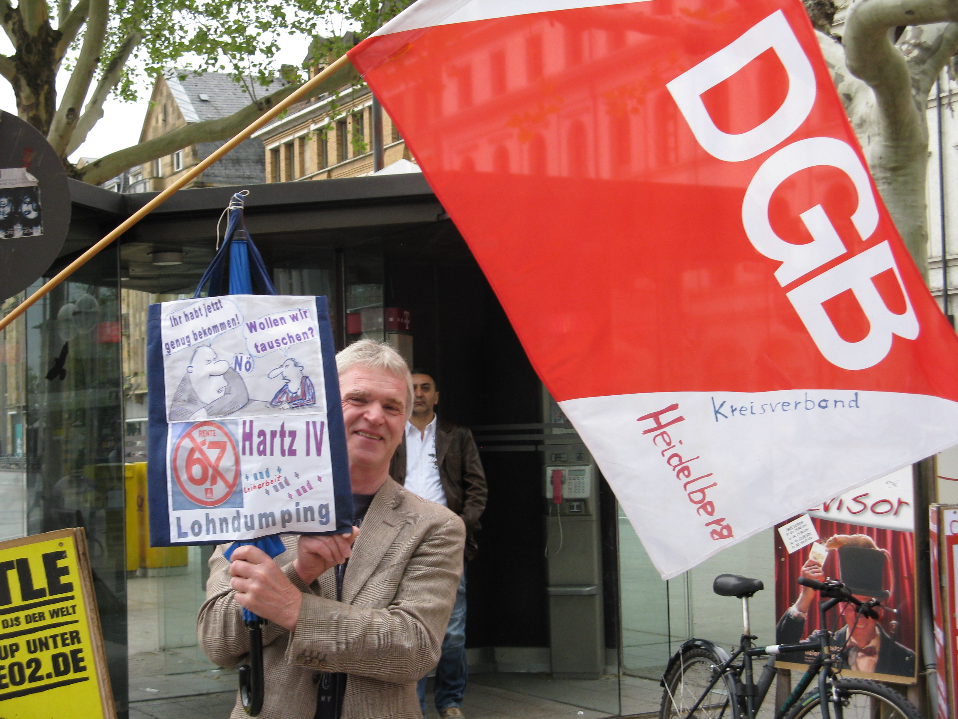 Kollege Peter Erni, der ver.di Vorsitzende Rhein-Neckar holte zum gesellschaftspolitischen Rundumschlag aus und traf dabei immer die richtig Schuldigen. Von Zwischenbeifall oft unterbrochen, las er den politischen Akteuren im Land die Leviten. Er erinnerte daran, dass wir mit gemeinsamen Aktionen aller DGB Mitgliedsgewerkschaften kämpfen müssen, um wieder erfolgreicher zu sein. In Fragen zum Mindestlohn, der Kopfpauschale, aber auch bei Hartz IV und der Leiharbeit, müssen wir uns zusammmen wehren. Arbeit muss zum Leben reichen, war eine seiner Kernaussagen. Überzeugend brachte Peter Erni seine Forderungen an Frau und Mann, und er machte deutlich, dass wir uns Alle zur Durchsetzung einklinken müssten. Er ließ niemanden aus der Verantwortung.