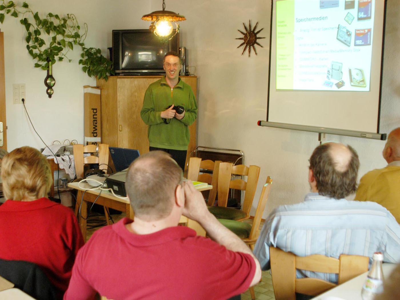Helmut Roos und Peter Oehmig führten die TeilnehmerInnen durch die Welt der digitalen Kameras und Bilder. Objektive und deren Einfluss auf die Bildqualität, Sensoren, Speicher, Datenformate, Urheberrecht waren die Inhalte des