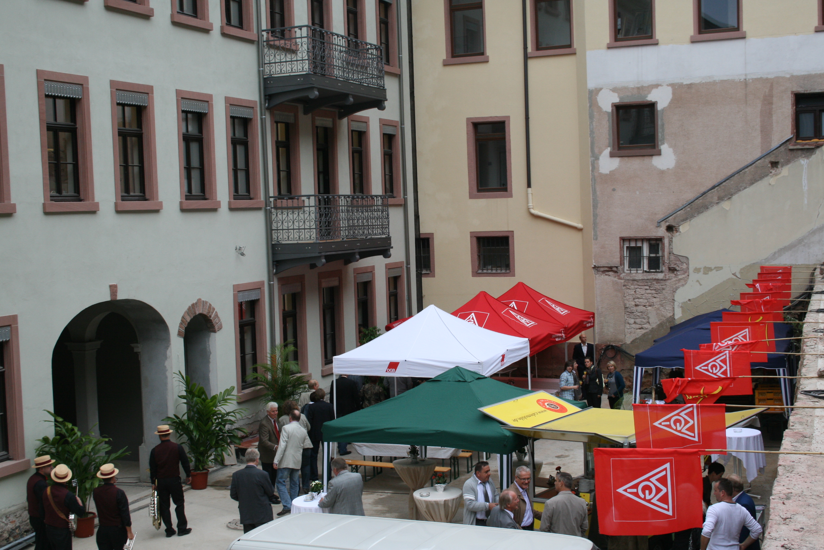 Zwar sind die Beschäftigten und auch eine größere Zahl von Funktionären und Mitglieder bereits seit über 4 Monaten in der Friedrich-Ebert-Anlage 24 am Wirken, wegen der immer noch andauernden Arbeiten an Fassade und Aussenanlagen hatte man die Feierlichkeiten aber bis nach der Sommerpause aufgeschoben.