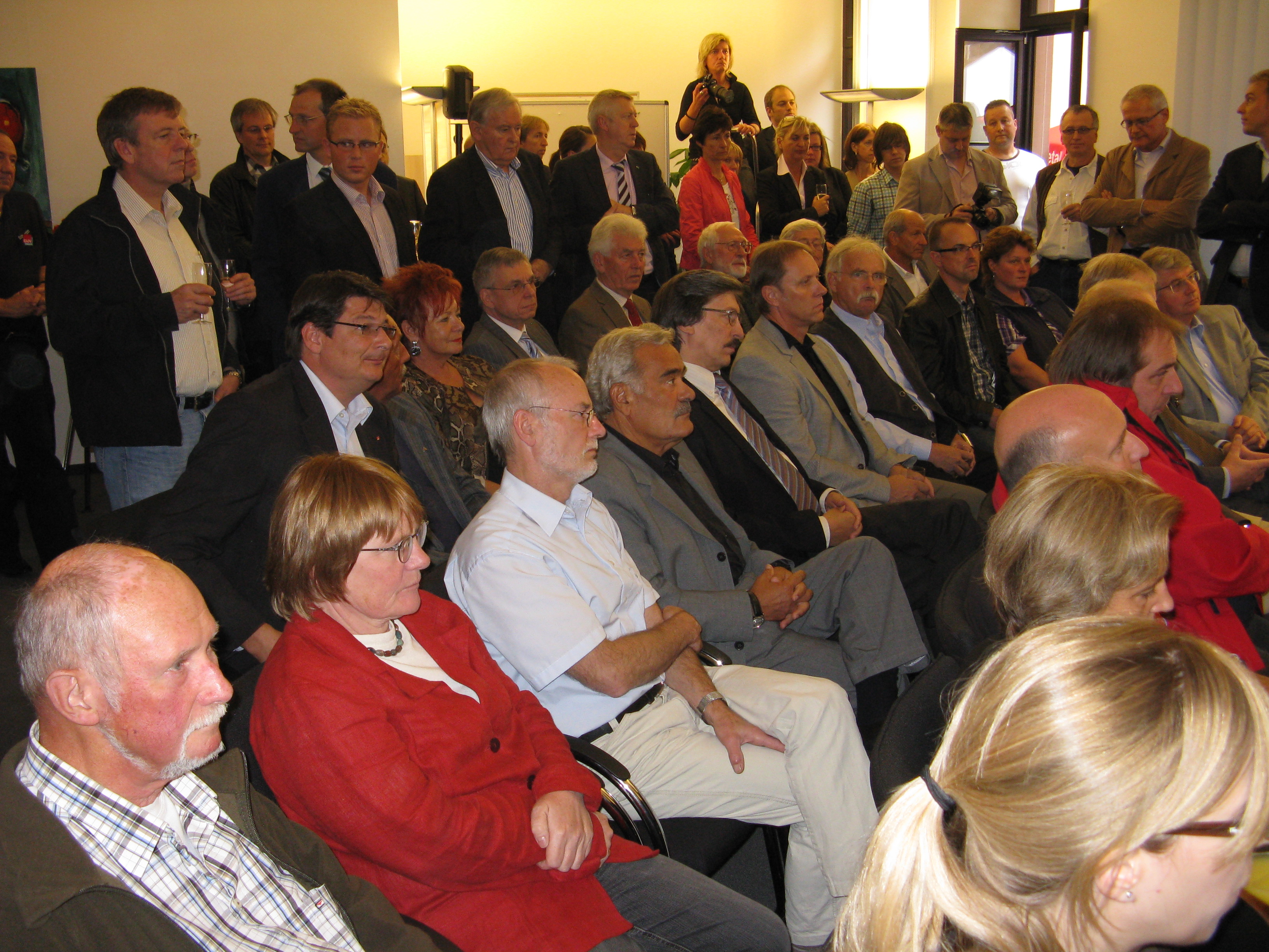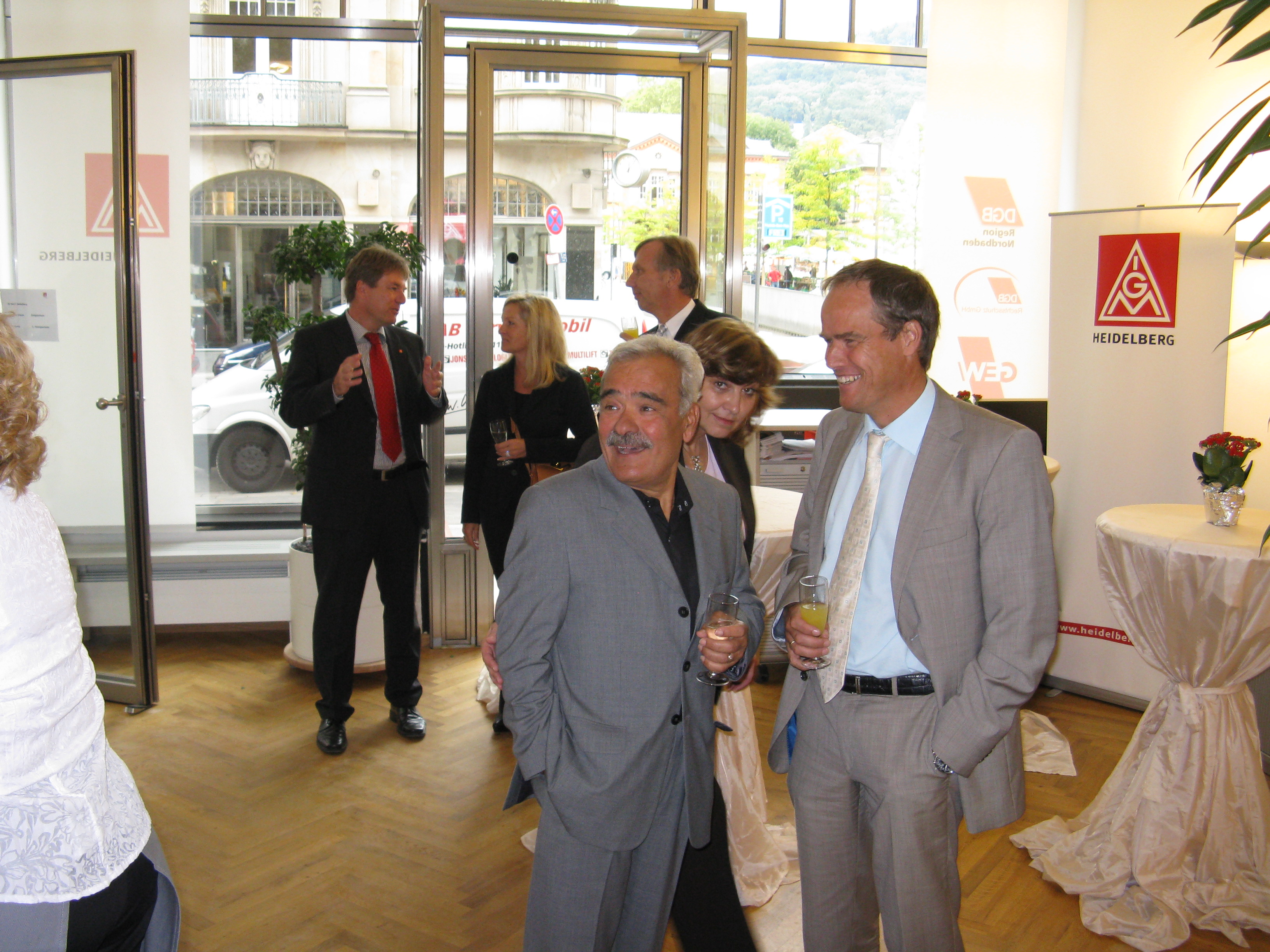 Der Zweite Bevollmächtigte Manfred Hoppe begrüßte die Gäste und entschuldigte Vorstandsmitglied und Kassier Bertin Eichler, der aufgrund einer kurzfristigen Erkrankung absagen musste. Besonders erwähnte er den Vermieter Prof. Reinhard Walter und dessen Frau, Beatrice von Waldberg, die als Projektleiterin für die gelungene Ausgestaltung der Räume verantwortlich zeichnete. Neben dem Oberbürgermeister der Stadt Heidelberg waren auch Dr. Rainer Dulger, Präsident des Arbeitgeberverbandes Südwestmetall, die Bevollmächtigten der Nachbarverwaltungsstellen Mannheim und Heilbronn, der DGB Regionsvorsitzende, der AOK-Geschäftsführer und eine große Zahl von Betriebsratsvorsitzenden aus der Region gekommen.