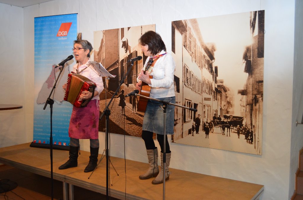 Den Auftakt machten die Musikerinnen: Blandine Bonjour und Francoise Saunier ("Les Francines") sangen das Lied von den Reisarbeiterinnen in der Poebene (La Lega) "Sebben che siamo donne/ paura non abbiamo...", ein Kampflied, das ihre durch kollektiven Zusammenschluss wachsende Kraft spüren lässt. Musik selbst ist ein Teil dieses Kraftzuwachses, bei wie vielen Arbeitskämpfen haben wir das schon erlebt! Deshalb haben diese Lieder ihren Platz an einem Tag wie diesem, an dem wir an Streiks erinnern, die von Frauen getragen waren. So auch "Brot und Rosen", das Lied, das uns an die beiden wichtigen Ziele dieser Kämpfe erinnert: die materielle Existenz zu wahren und zu verbessern und in Würde zu leben. Dazu gehört Gleichberechtigung in der Gesellschaft, Demokratie, Frieden und vieles mehr.